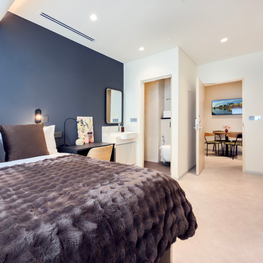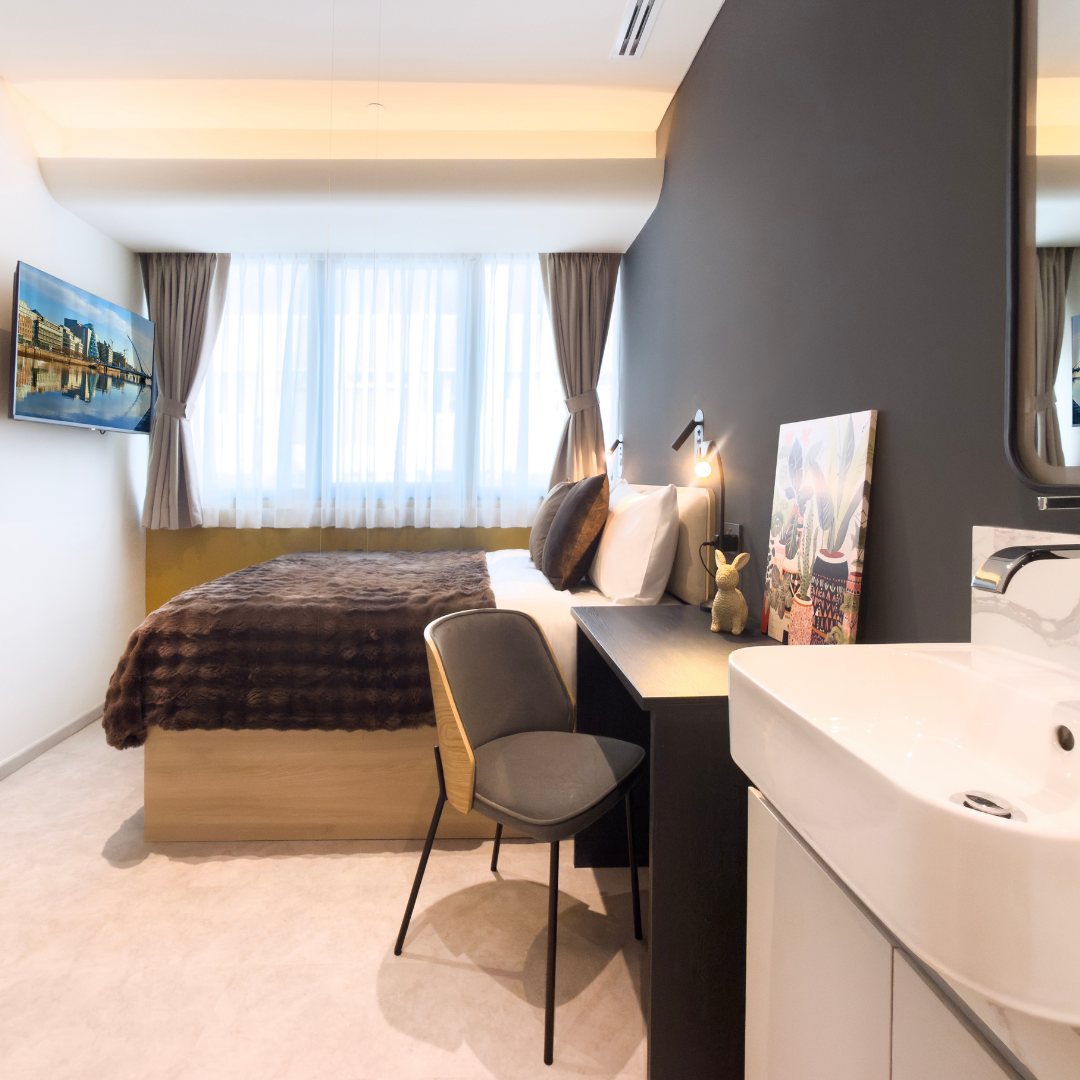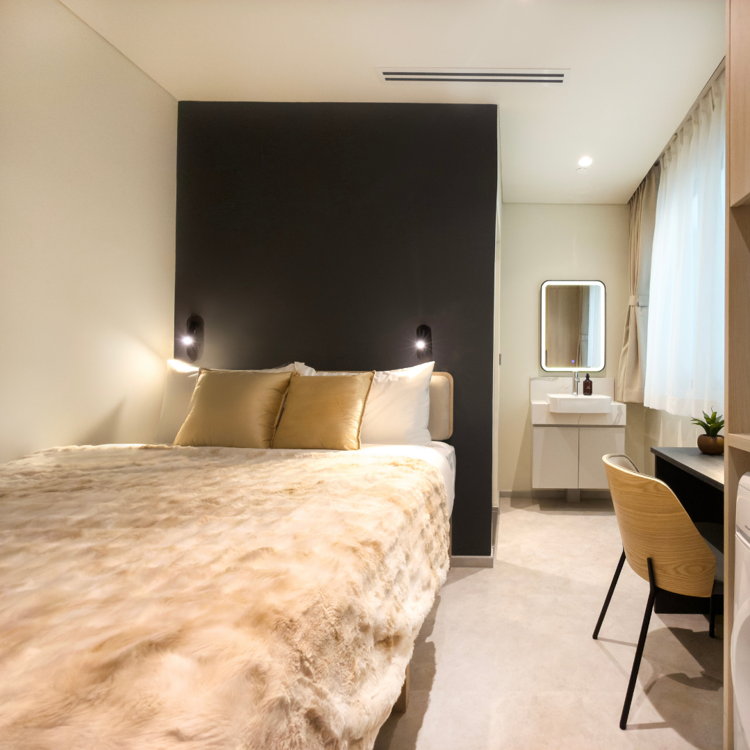 Take 3D tourThe Deluxe Chamber provides simple, easy living with a workstation, ensuite bathroom, and in room washer-dryer. Members also enjoy access to a shared kitchenette, making it a practical choice for busy individuals.