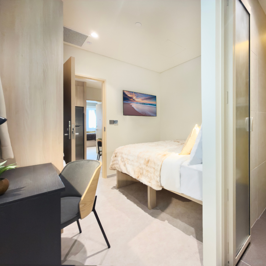 Take 3D tourThe Two-Bedroom Studio offers a contemporary layout with two separate sleeping areas and shared living essentials in one cohesive space. It comes fully furnished and includes a functional workstation, an ensuite bathroom, a washer-dryer, and a convenient kitchenette. Ideal for shared living without compromise, this studio brings together privacy, practicality, in a well-curated home.